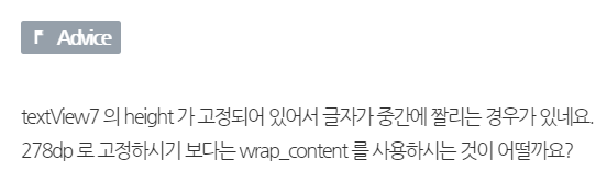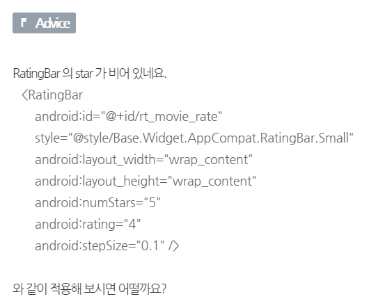 Ratingbar의 별 개수나 textView의 글자가 짤리는 경우는 제가 프로젝트를 진행하면서 실제로 고민했던 부분인데, 이렇게 코드 리뷰로 해결 방법을 알 수 있게 되었군요. 전문가 입장에서의 리뷰라 작은 부분도 놓치지 않고 검토하는 세심함이 돋보입니다.