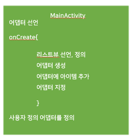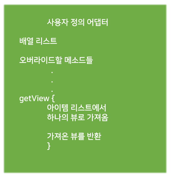우선 어댑터가 정의되어 있어야 합니다. 일반적으로는 BaseAdapter를 상속한 새 어댑터를 만들어 사용합니다. 새 어댑터에 필요한 기능을 추가해줍니다. 직접 Adapter 클래스를 정의하지 않는 경우에는 ArrayAdapter가 많이 쓰입니다.