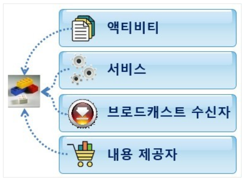 애플리케이션 구성요소에는 액티비티를 비롯하여 서비스, 브로드캐스트 수신자, 내용 제공자가 포함됩니다.