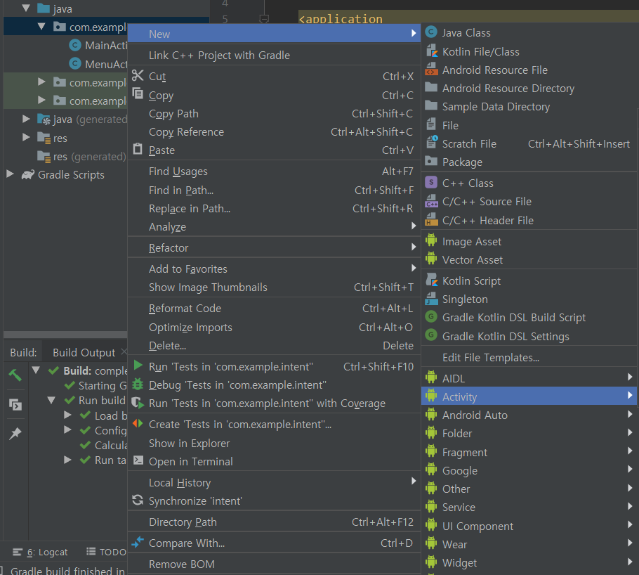 첫번째, 새로운 액티비티를 만드는 것은 패키지 경로에 new - activity를 선택하여 만들고 싶은 액티비티의 형태를 선택합니다. 그리고 나서 적절한 이름을 지정해주면 됩니다. 액티비티 형태는 프로젝트와 마찬가지로 빈 액티비티가 주로 사용됩니다.