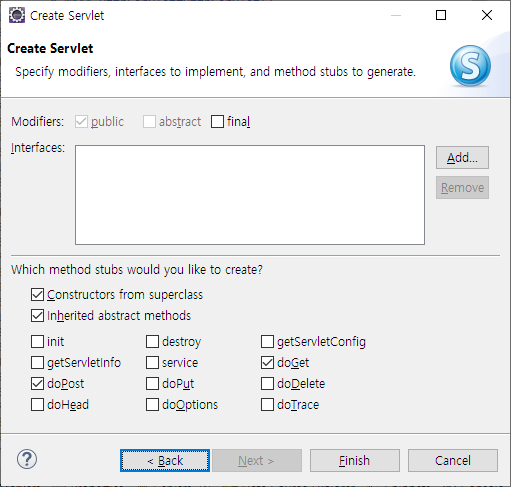 그리고 필요한 메소드들을 체크한 뒤 Finish를 눌러 서블릿 생성을 완료하시면 됩니다.