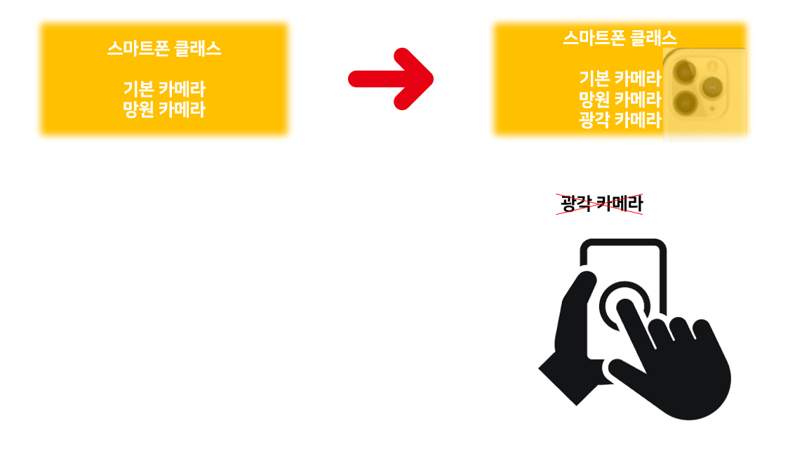 스마트폰 클래스와 상호작용하던 사용자 클래스에서 광각 카메라를 사용할 수 없게 됩니다. 기존에 빌드되었던 것은 광각 카메라가 없는 스마트폰이었으니까요.