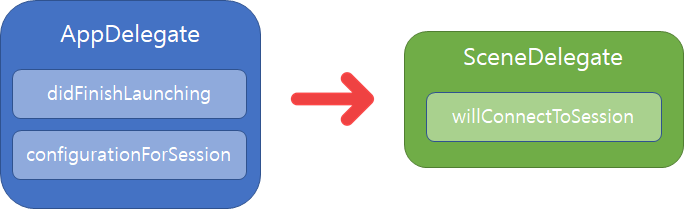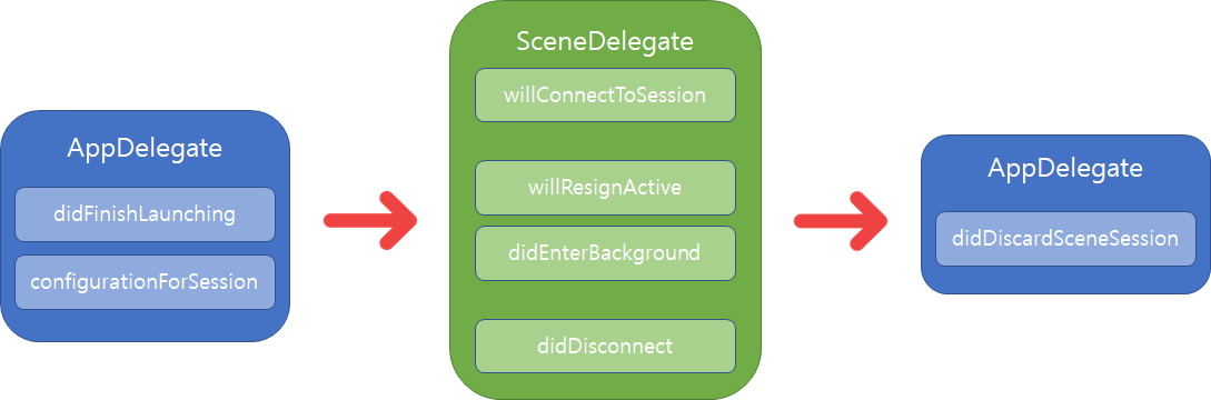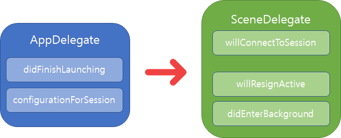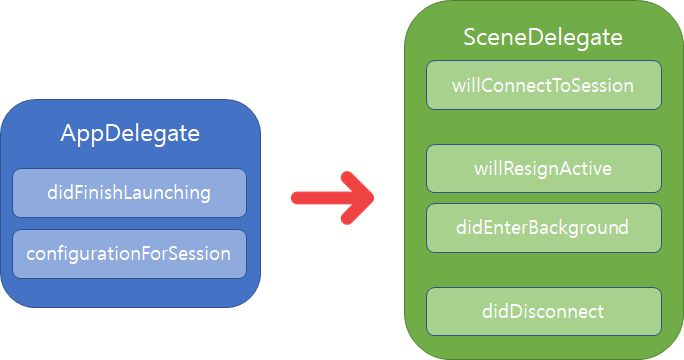 iOS 13이후의 scene-based 앱에선 각 생명주기의 이벤트를 처리하는 데 UISceneDelegate 객체를 사용합니다.