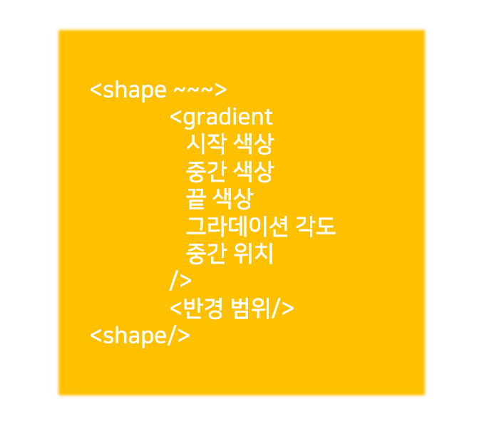쉐이프 드로어블은 배경으로 그라데이션을 사용할 수도 있습니다. 그라데이션을 사용할 때에는 시작 색, 중간 색, 끝 색과 각도가 들어가야 하고, 중간 지점을 설정할 수 있습니다. 아래와 같은 코드 형식으로 그라데이션을 설정합니다.