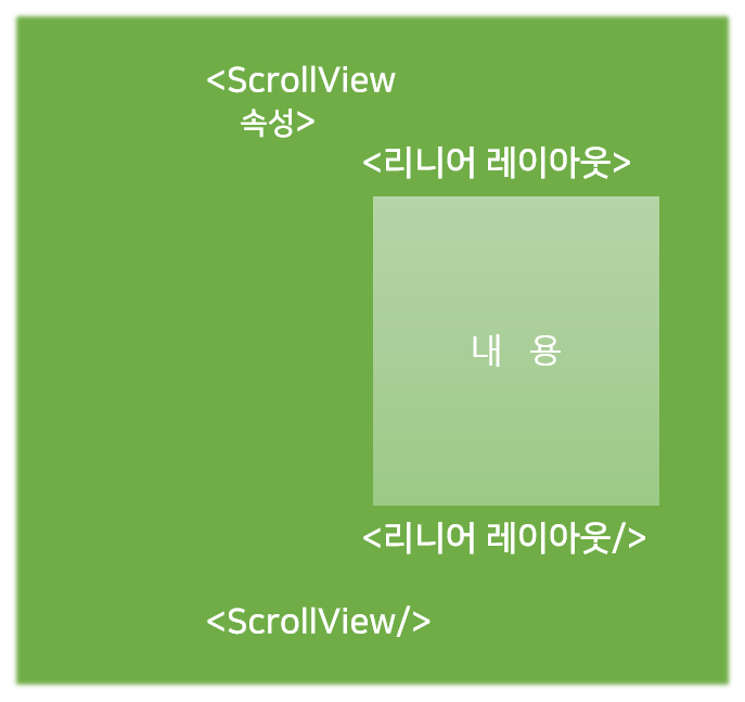 그런데, 스크롤뷰 안에는 하나의 레이아웃만 들어갈 수 있기 때문에 스크롤뷰에 리니어 레이아웃을 넣고 사용하는 것이 일반적입니다. 위 그림처럼 말이죠.