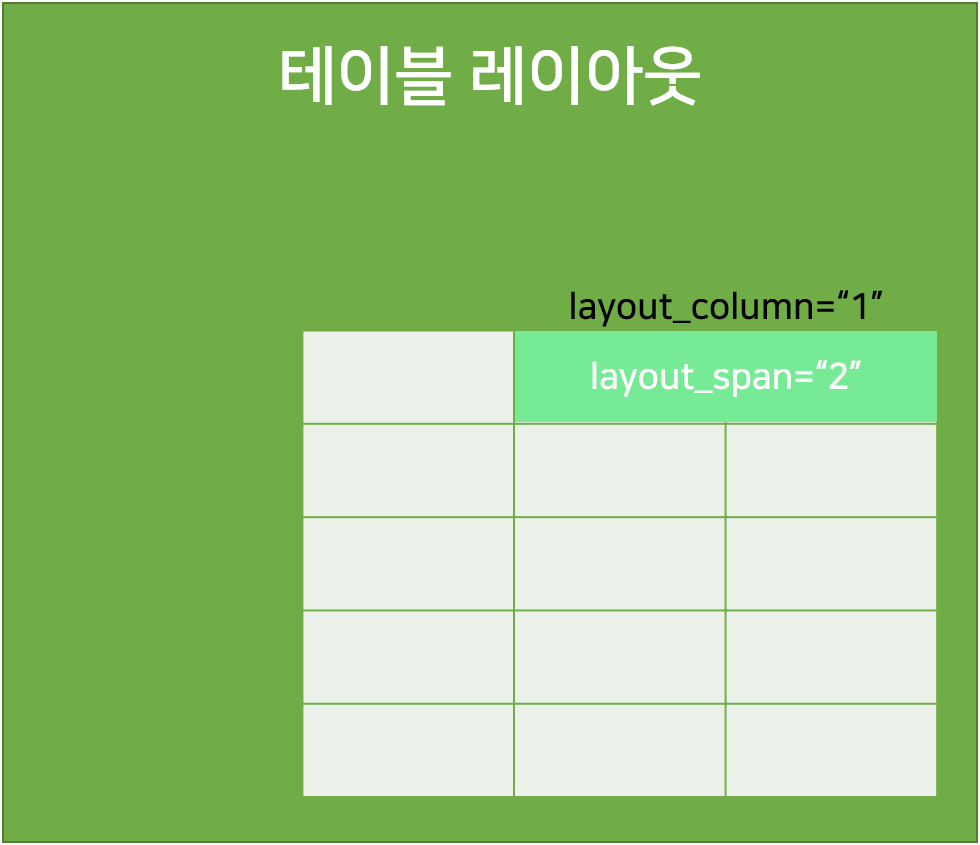 그런데 워드나 엑셀의 표는 하나의 데이터가 여러 칸을 차지하거나, 첫번째 열이 아닌 곳부터 데이터가 들어갈 때가 있습니다. 테이블 레이아웃도 물론 이런 기능을 구현할 수 있습니다. layout_column을 활용해 뷰가 들어갈 열을 정해줄 수 있고, layout_span을 통해 뷰가 차지할 칸의 개수를 정해줄 수 있습니다.