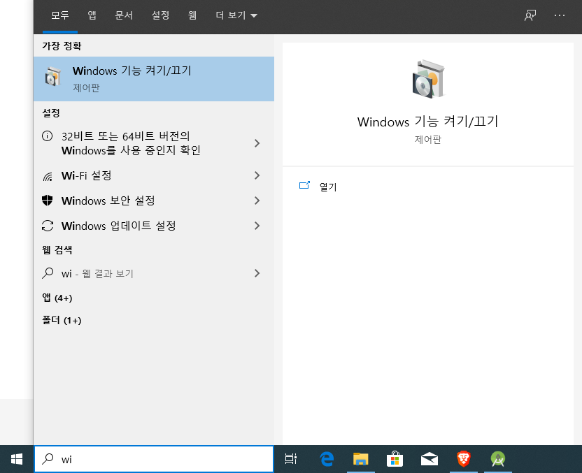 또는 윈도우 버튼을 누르고 Windows 기능/켜기 끄기를 검색하여 클릭합니다.