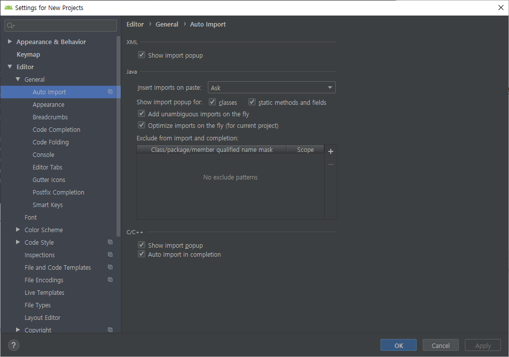 따라서 안드로이드 스튜디오의 설정 화면에서 imports on the fly 기능을 활성화시키면